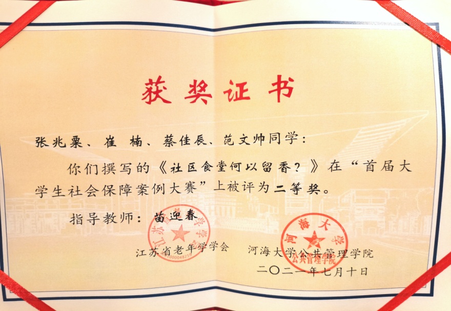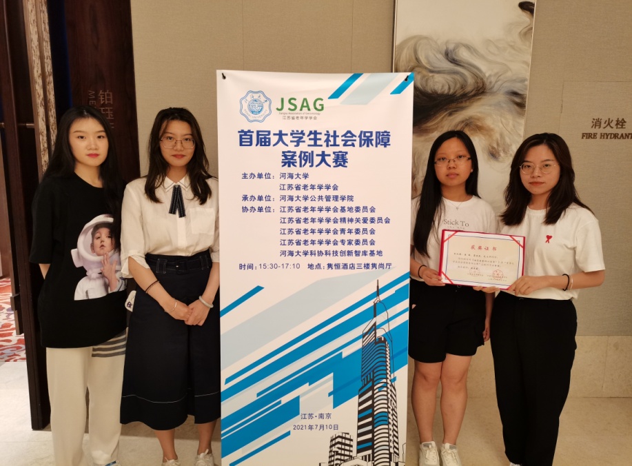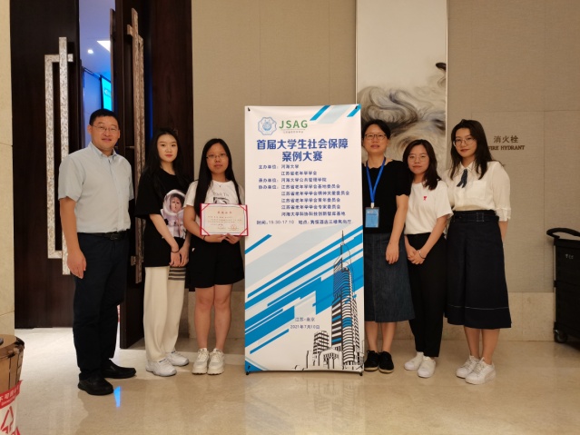 7月10日,由江苏省老年学学会、河海大学主办,河海大学必威西汉姆官网平台承办的“首届大学生社会保障案例大赛”颁奖大会,在十朝都会、人杰地灵的江苏省南京市隆重举行,必威西汉姆官网平台苗迎春老师指导的2020级社会保障研究生团队荣获二等奖,团队成员张兆粟、崔楠、蔡佳辰、范文帅赴宁参加颁奖典礼。