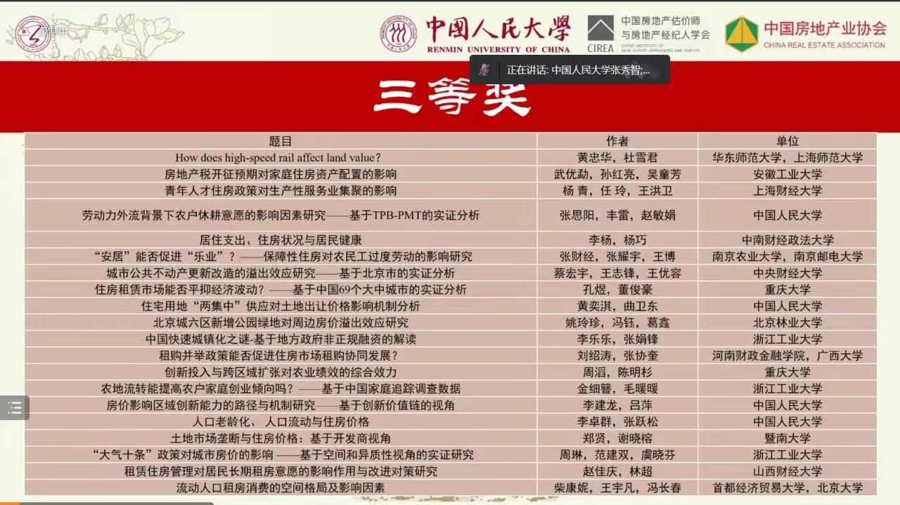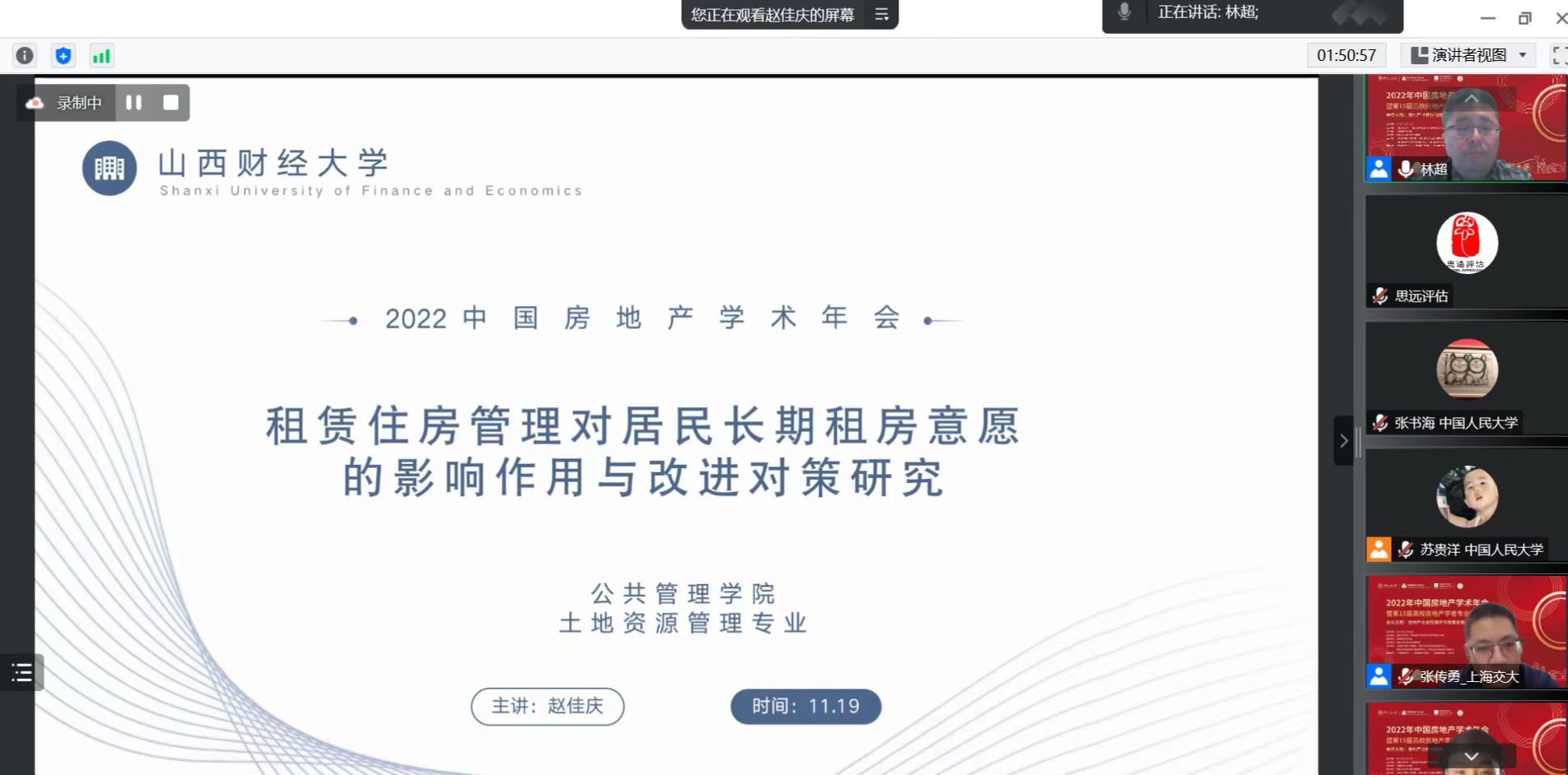 2022年中国房地产学术年会暨第15届高校房地产学者专业研讨会于2022年11月19日以线上方式成功召开。本次会议由中国人民大学、中国房地产估价师与房地产经纪人学会主办,中国人民大学必威西汉姆官网平台承办,会议主题为“房地产业良性循环与健康发展”。由林超副教授指导,研究生赵佳庆撰写的《租赁住房管理对居民长期租房意愿的影响作用与改进对策研究》在年会进行汇报并获论文三等奖。