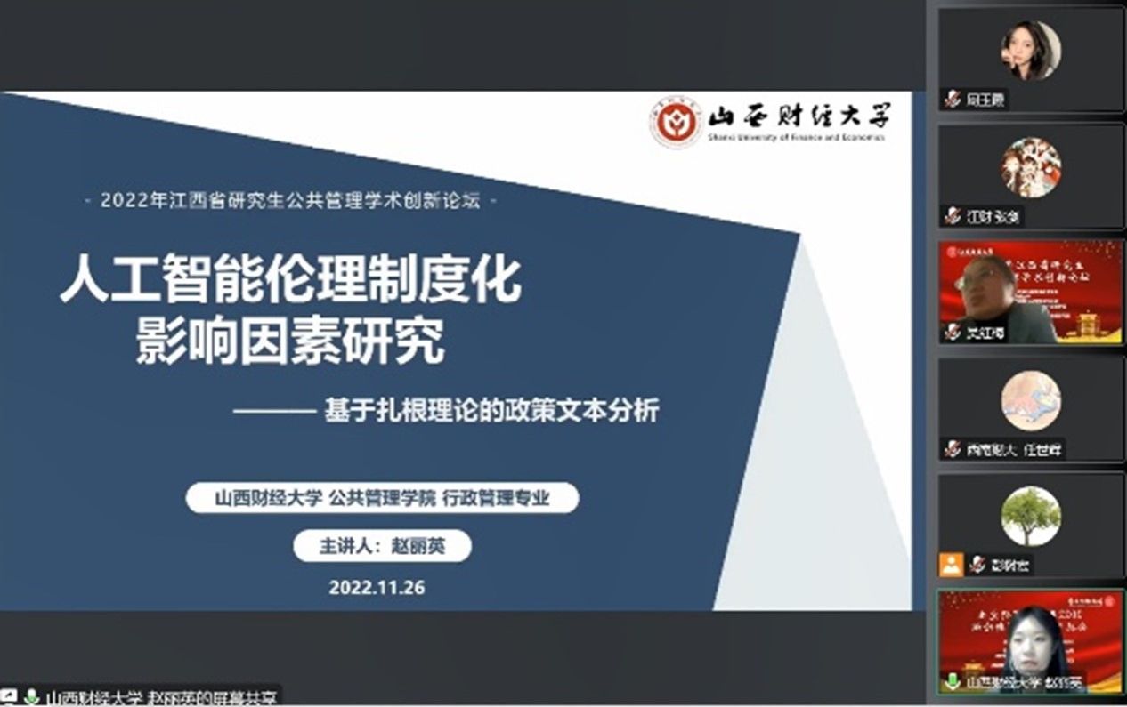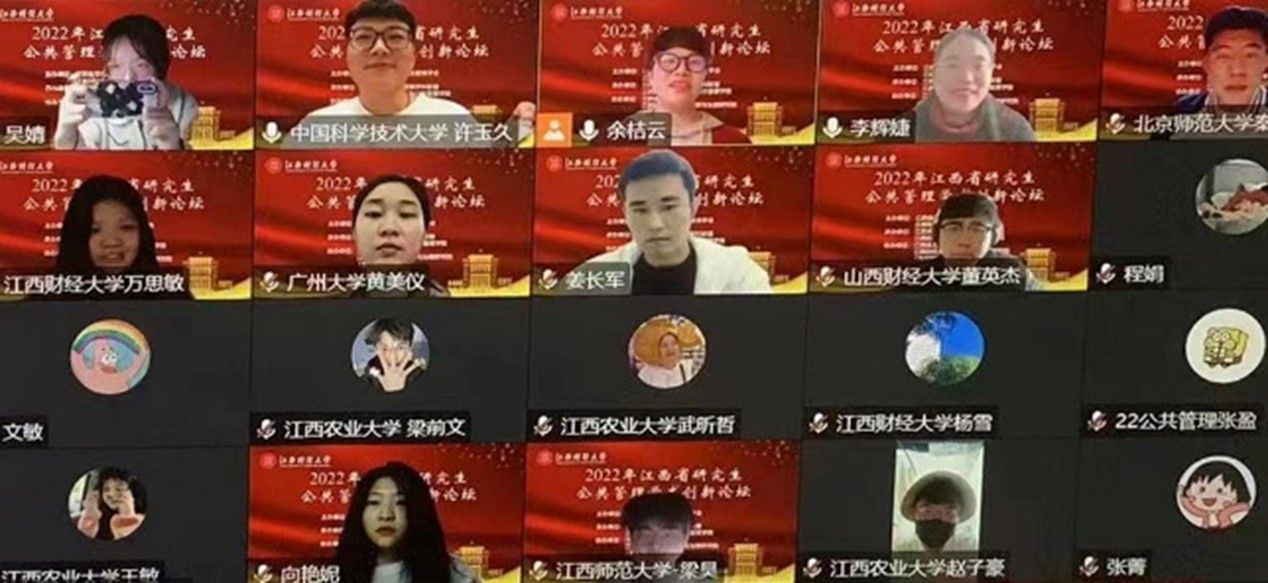 2022年11月26日,由江西省学位与研究生教育学会、江西财经大学主办,江西省高校公共管理学科联盟、江西财经大学财税与必威西汉姆官网平台承办的2022年江西省研究生公共管理学术创新论坛以线上方式顺利召开。此次论坛的主题为“数字化时代的公共治理理论与创新”,来自全国公共管理学科的专家学者、硕博研究生共计290余人在线参会。我院2020级行政管理研究生王琼琼、2020级社会保障研究生董英杰、2021级行政管理研究生赵丽英三位同学应邀参会并发言。