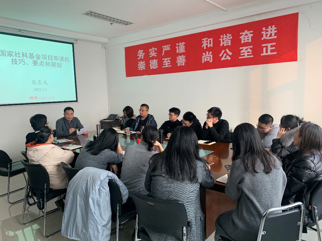 2022年1月6日,必威西汉姆官网平台“待见·学术工作坊”举办了第七期学术研讨活动。教育经济与管理教研室主任宋东风博士作了题为“国家社科基金项目申请的技巧、要点和规划”的学术分享,本次活动由行政管理系主任刘海燕博士主持。
