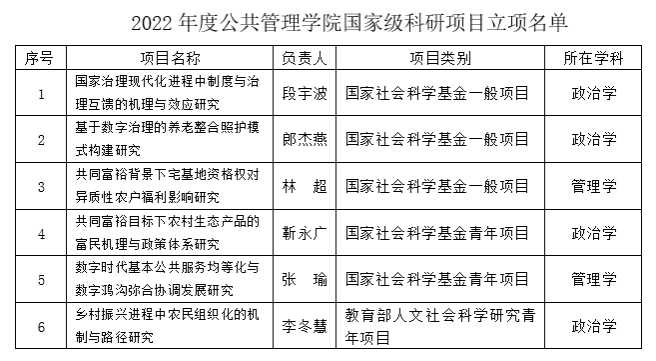 近年来,我院度重视国家级科研项目申报工作,每年及时对项目申报工作进行充分动员,并对项目申报工作提供精准指导和服务。今年李冬慧博士获批教育部人文社科青年项目1项,至此我院2022年共获批国家级科研项目6项。我院在国家级科研项目立项上取得重要突破,必将有力推动全院科研实力大幅提升,促进公共管理学科建设提档升级。