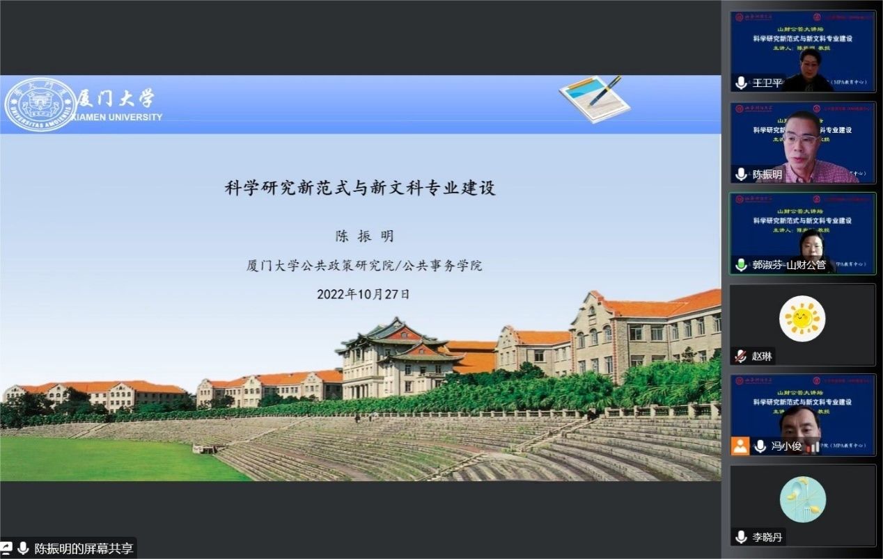 2022年10月27日,由必威西汉姆官网平台主办的“山财公管大讲坛”正式开讲,厦门大学公共政策研究院教授兼院长、厦门大学社会科学学部主任、“长江学者”特聘教授陈振明拨冗莅临第一讲做了题为“科学研究新范式与新文科专业建设”的报告。校党委副书记、公共管理一级学科带头人王卫平教授主持了本次大讲坛。来自校内外的300余名师生线上聆听了报告。
