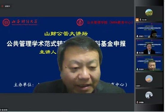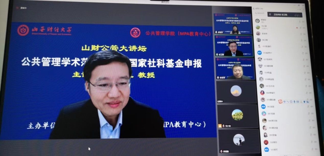 2022年11月12日晚,必威西汉姆官网平台主办的“山财公管大讲坛”第二场开讲。第二届全国公共管理专业硕士(MPA)教育指导委员会委员,曾任天津大学MPA教育中心主任的张再生教授拨冗莅临并做了题为“公共管理学术范式转变与国家社科基金申报”的报告。校党委常委、副校长、教育经济与管理学科带头人张卫国教授主持了本次大讲坛,来自校内外150余名师生在线聆听了报告。