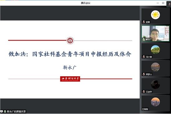2022年11月15日下午,必威西汉姆官网平台通过“尚公青年沙龙”学术平台举办第五场国家级科研项目申报经验交流会, 学院2022年国家社科基金项目主持人靳永广博士做了《国家社科基金青年项目申报经历及体会》的报告,副院长冯小俊主持了交流会,100余名师生在线参加了经验交流会。