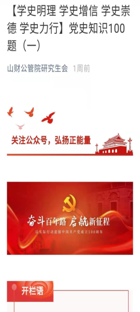 “党史知识100题”学习栏目,通过系统梳理党的历史发展脉络,重温党的百年奋斗历程,认识党为国家和民族做出的伟大贡献,感悟初心使命,传承伟大精神,汲取成长动力,树立坚定不移跟党走的信念和决心。同学们纷纷表示要认真学党史、潜心悟思想,用实际行动为党的百年华诞交上满意的答卷。